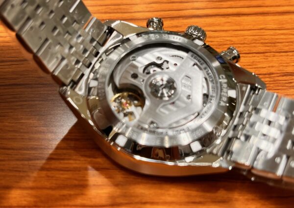 100m防水を兼ね備え、裏蓋からはそのムーブメントの動きが見れるシースルーバック仕様です。