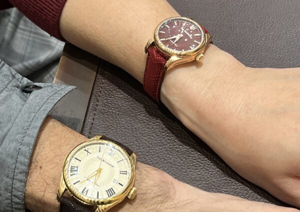 お二人共、こちらのモデルを何度かご覧いただき、その独特なダマスカス鋼の模様やベルト、そして文字盤の美しさを気に入っていただけました。